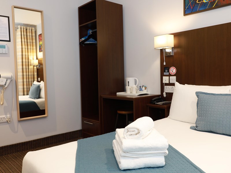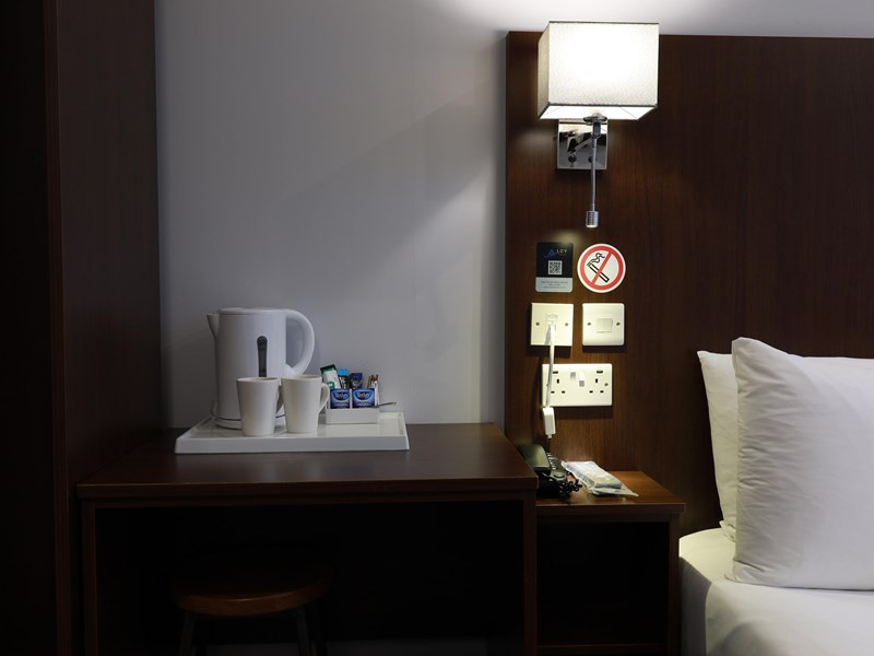 Commodious rooms with a standard double bed fitted with white cotton linens and towels. The room features a modern desk workspace, Flat-screen smart TV, hair dryer, tea and coffee facilities, and high-speed free wireless internet. It has a walk-in shower with anti-scald protection monsoon overhead and a hand shower. 5 mins walk from LCY airport to hotel.