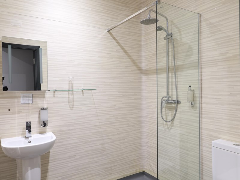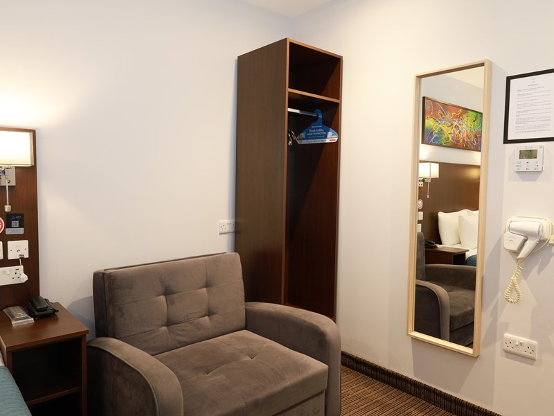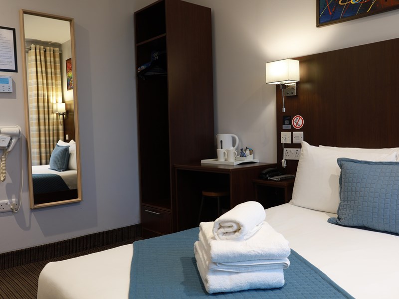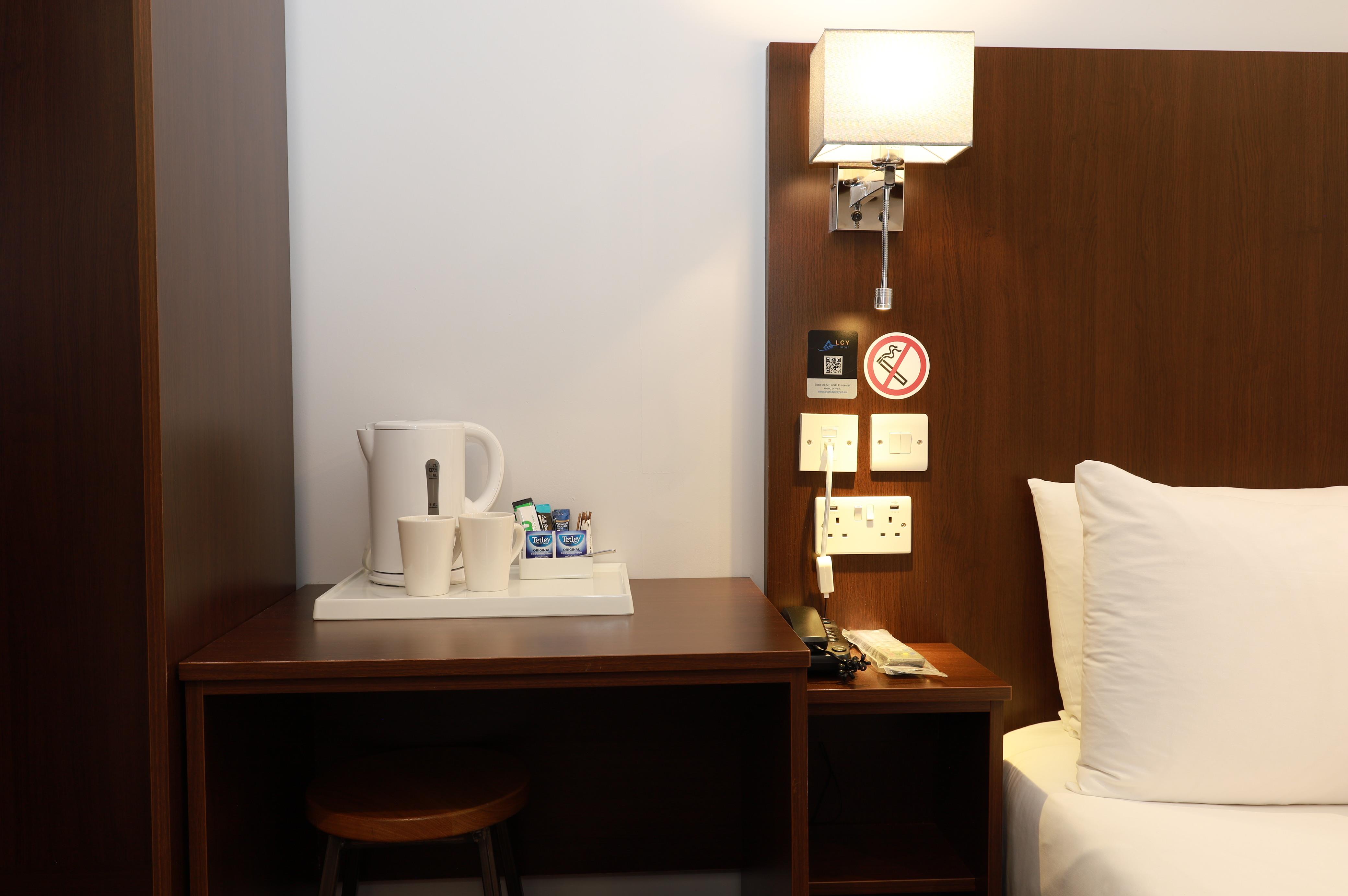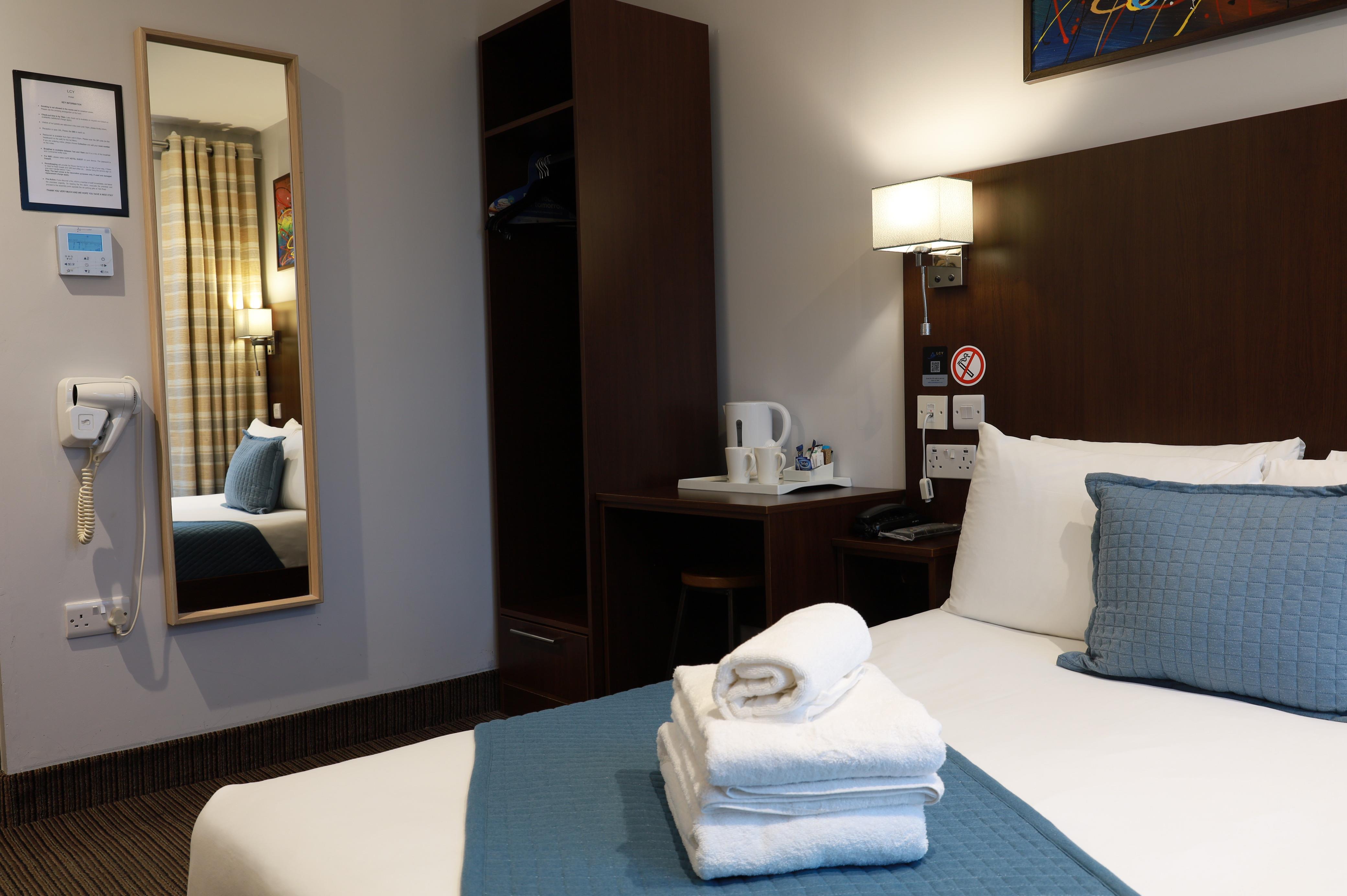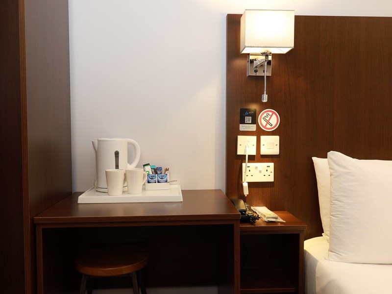 A standard room with a king size bed, fitted with white cotton linens and towels. The room features a modern desk workspace, Flat-screen smart TV, hair dryer, tea and coffee facilities, and high-speed free wireless internet. It has a walk-in shower with anti-scald protection monsoon overhead and a hand shower. 5 mins walk from LCY airport to hotel.
